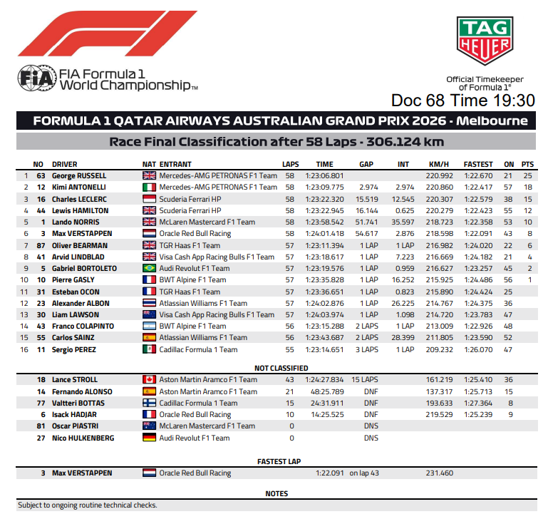 Гран-прі Австралії 2026, попри побоювання щодо обгонів через новий технічний регламент, подарувало вболівальникам безкомпромісну боротьбу на трасі, яка тримала в напрузі, особливо на перших колах дистанції. Головним героєм вікенду став Джордж Расселл, який не лише здобув перемогу, а й продемонстрував залізну витримку в дуелі з командою Ferrari. Проте драма розпочалася ще до старту, Оскар Піастрі не зміг стартувати на домашньому Гран-прі, оскільки розбив болід ще до старту, також перед стартом болід Ніко Гюлькенберга закотили в бокси перед стартом, тож німець теж не брав участь у гонці.